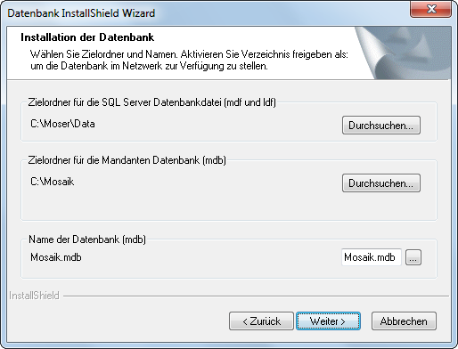 Anschließend wählen Sie zu verwendende MOS'aik-Datenbank aus. Auch hier sollten die Einstellungen bereits korrekt sein, können jedoch andernfalls über die Schaltflächen bzw. angepasst werden. Klicken Sie auf . |